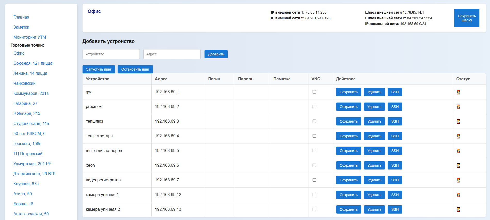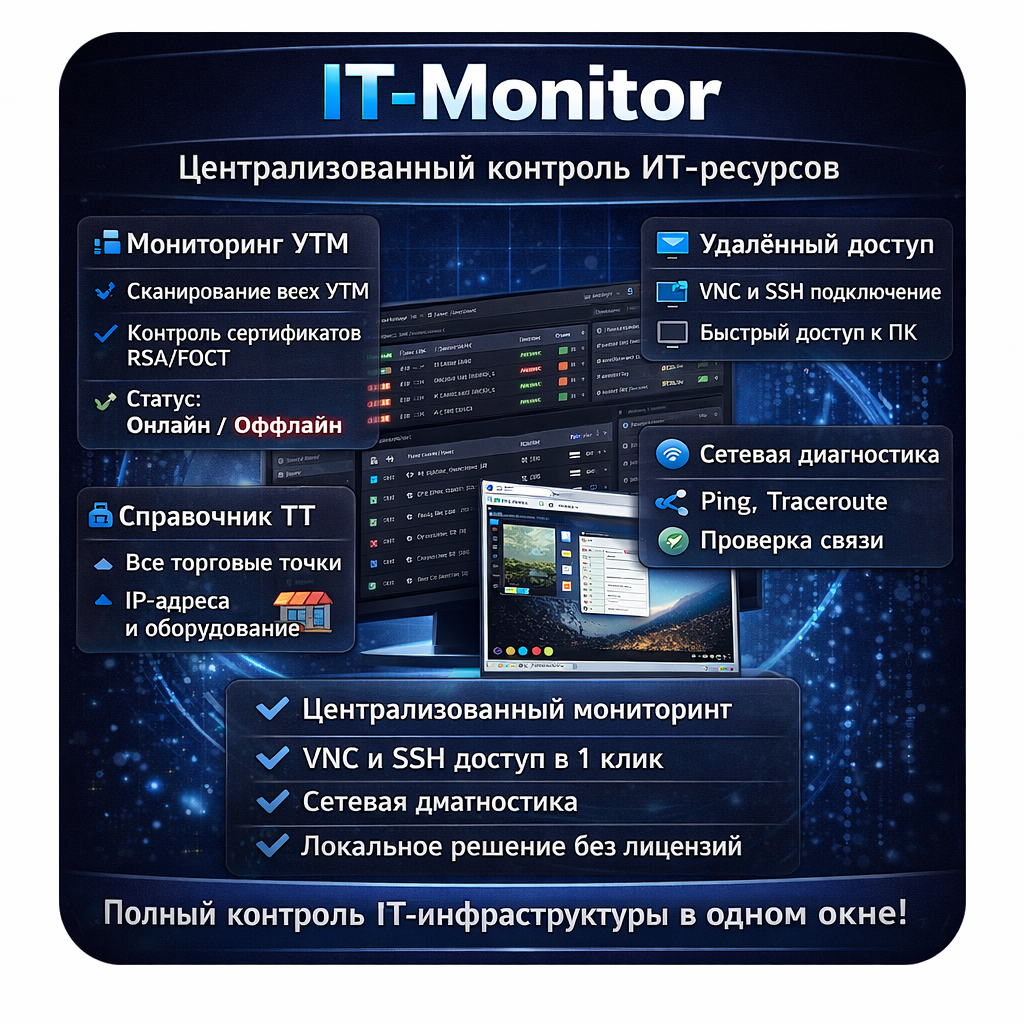 IT-Monitor — это внутренняя веб-платформа для централизованного мониторинга, управления и документирования ИТ-ресурсов сети офиса или торговых точек. Решение объединяет ключевые инструменты системного администратора в одном интерфейсе: от проверки работоспособности УТМ до удалённого доступа и ведения технической документации.