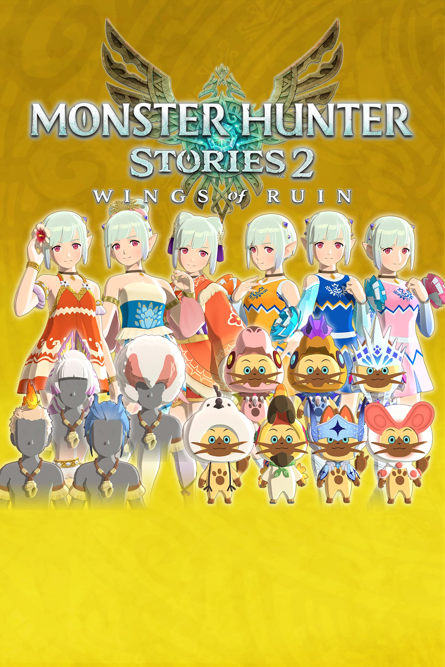 Содержимое: Одежды Ena: ● Tropical Dress ● Felyne Shelter Garb ● Ancient Raiment ● Cheerleader Three-Pack (Blue/Orange/Pink) Одежды Navirou: ● Downy Duds ● Kulu-Ya-Ku Costume ● Legiana Costume ● Paolumu Costume ● Anjanath Costume ● Fulgur Anja Costume ● Velkhana Costume Прически Rider: ● Shaggy Legiana ● Lumu Afro ● Mizutsune Braid ● Mohawk Kulu Все содержимое косметическое и не дает никаких преимуществ статуса. Примечание: После покупки перезапустите игру, чтобы получить дополнительный контент. Одежды и прически можно менять с помощью сундука в Your House после продвижения в игре до определенного момента. Каждый предмет также доступен для индивидуальной покупки.