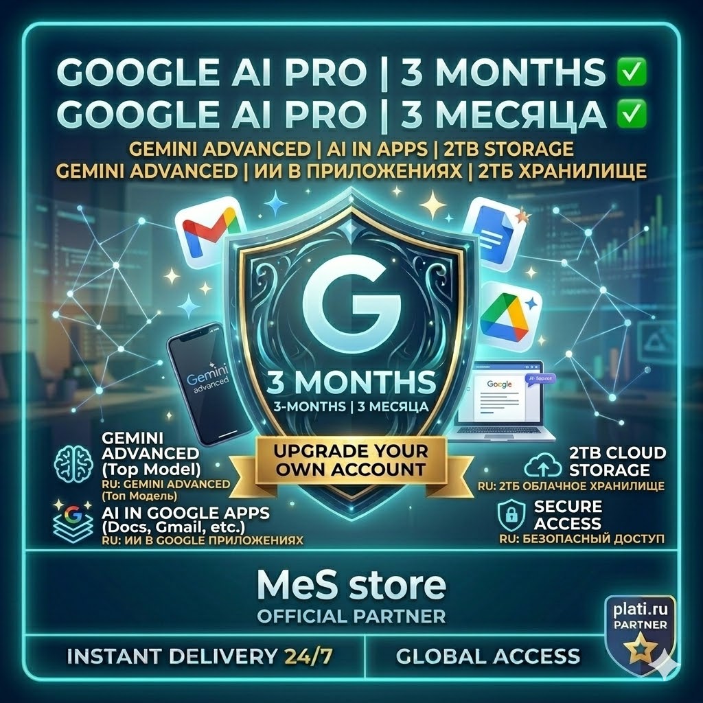 Шагните в будущее с ультимативным опытом от Google! С этой покупкой вы получите полную 3-МЕСЯЧНУЮ (90 ДНЕЙ) подписку на Google One AI Premium, активированную прямо на ВАШ СОБСТВЕННЫЙ личный аккаунт. 100% приватный, безопасный и официальный доступ.