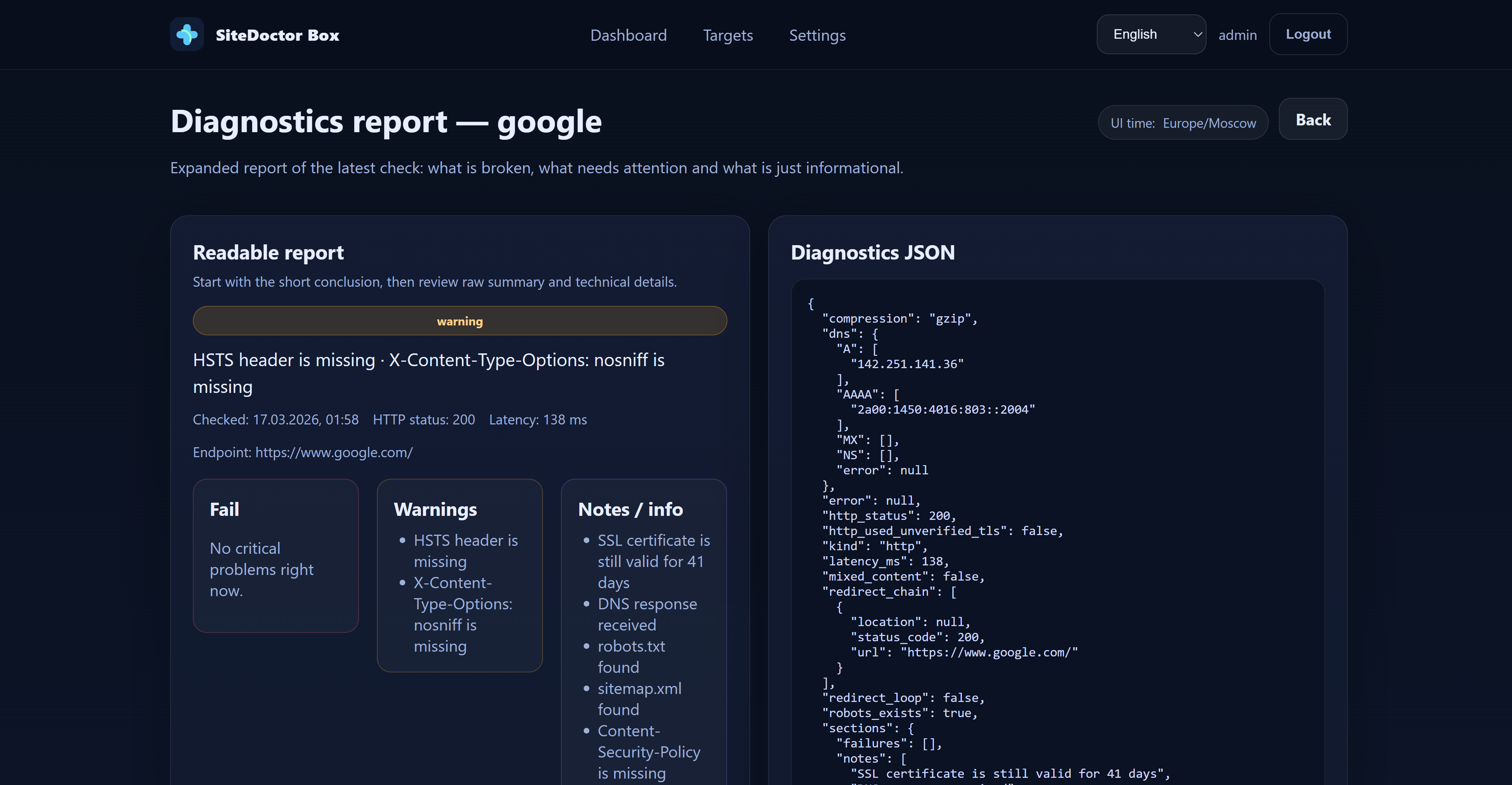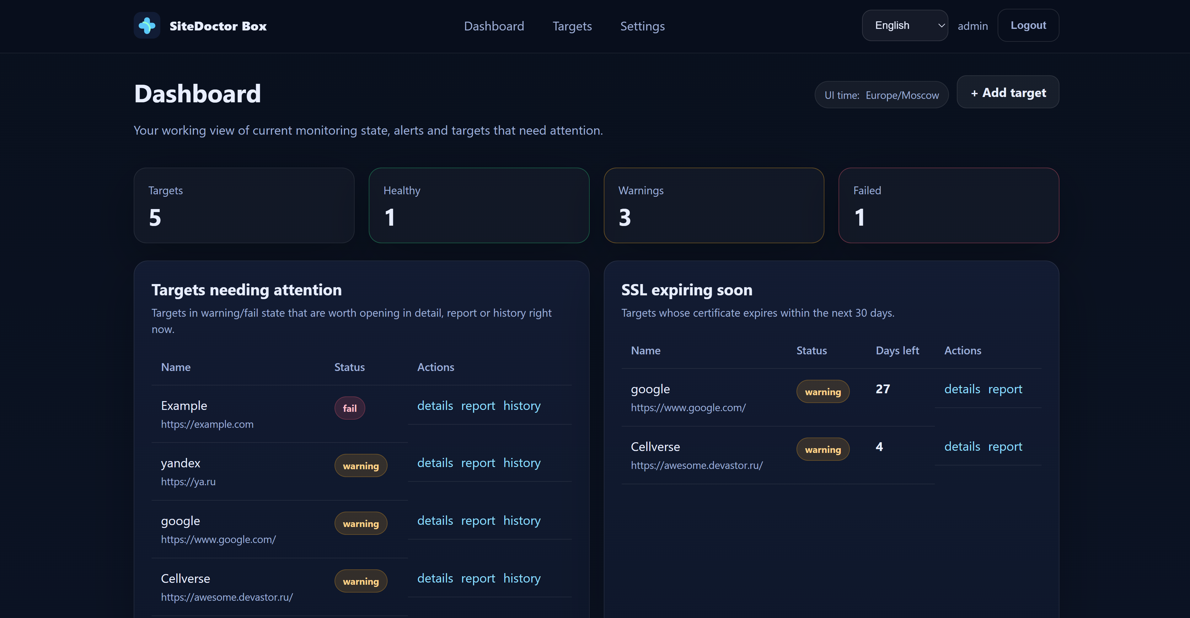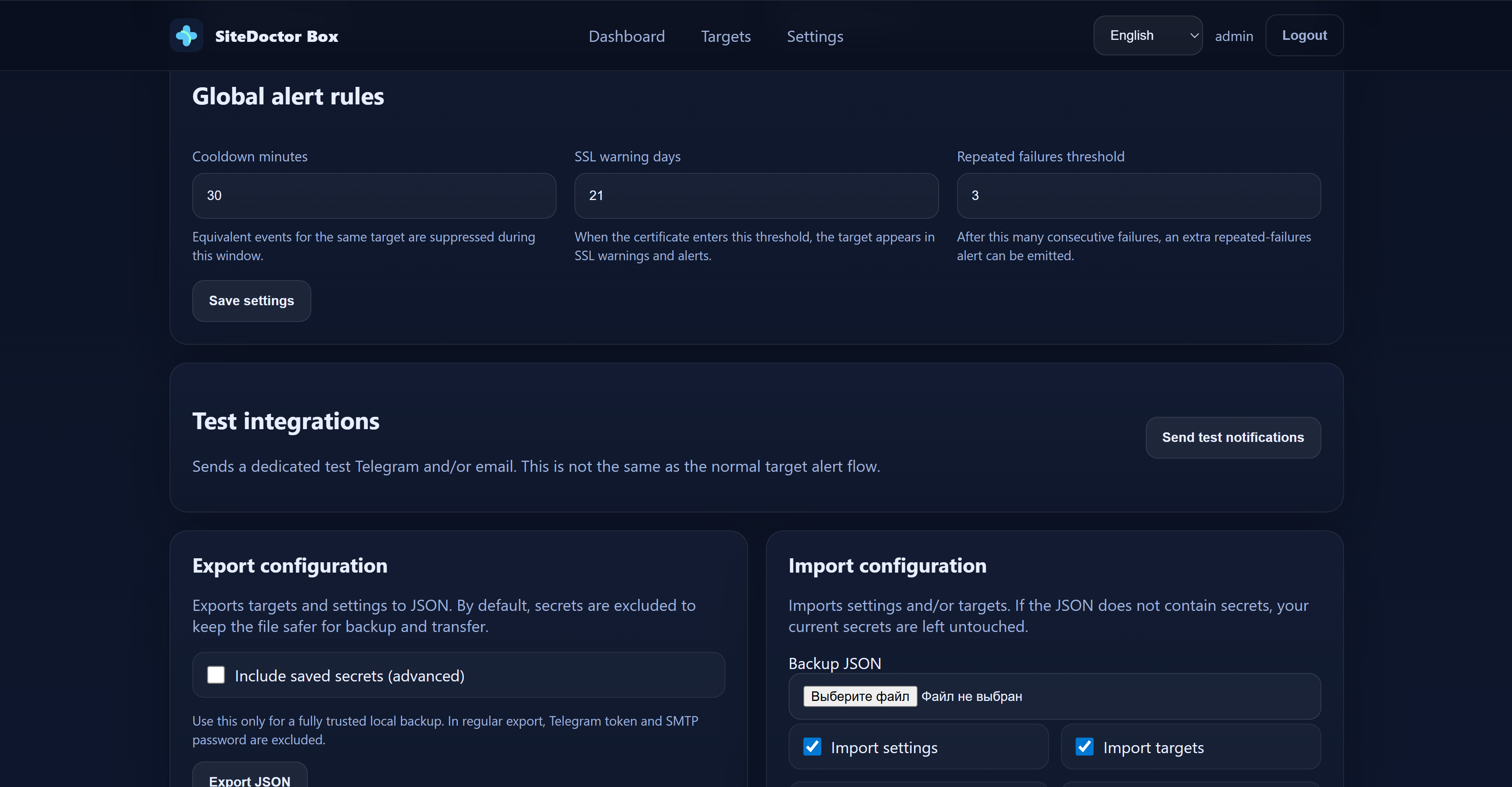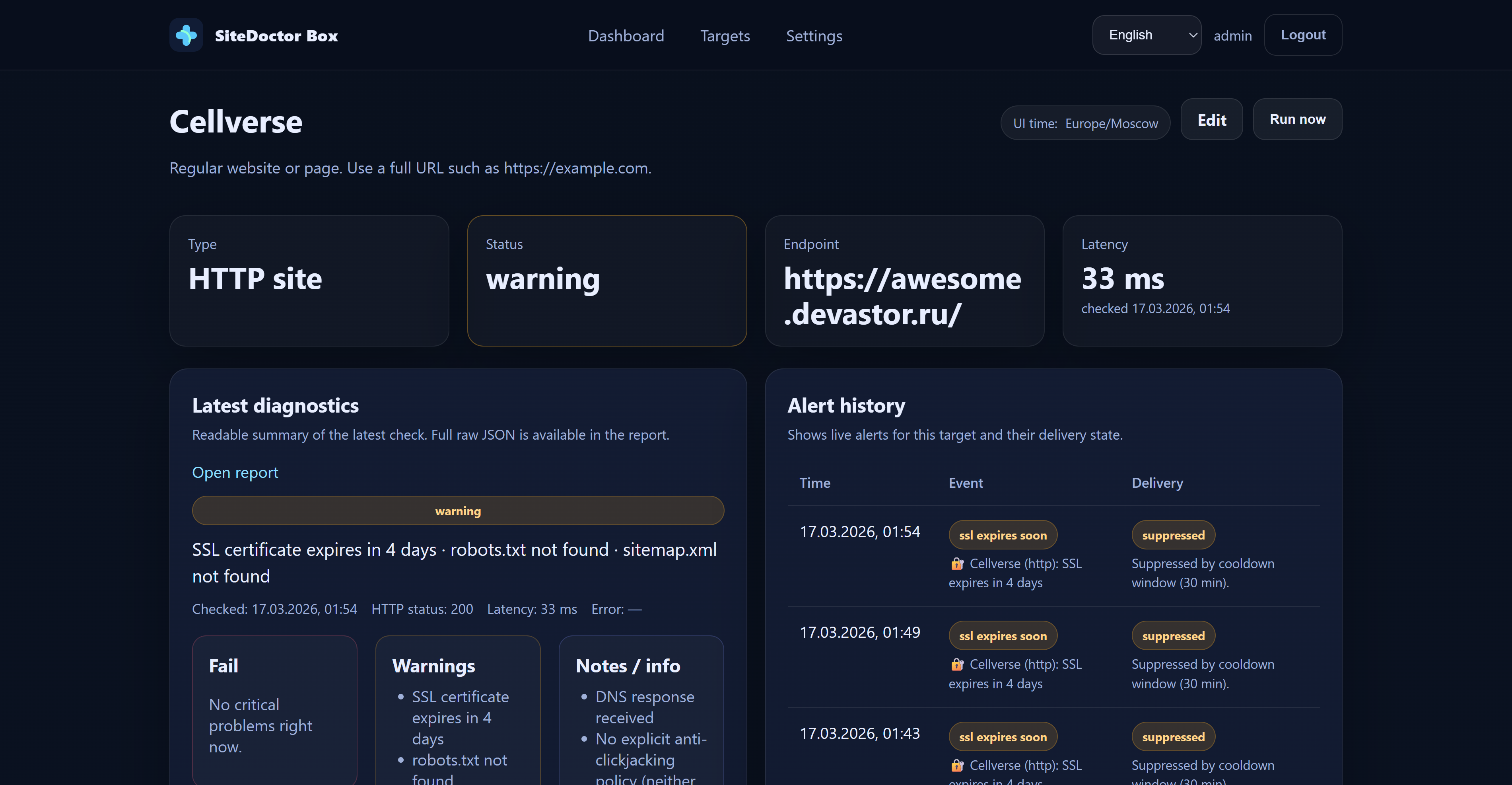 SiteDoctor Box Basic Edition — это self-hosted продукт мониторинга для сайтов, API и VPS-эндпоинтов.