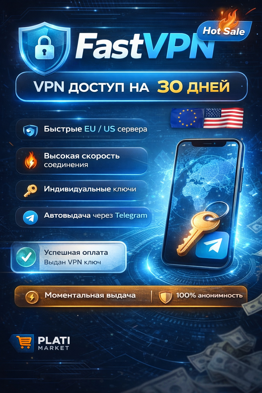 🔐 VPN доступ на 30 дней (EU / US сервера)