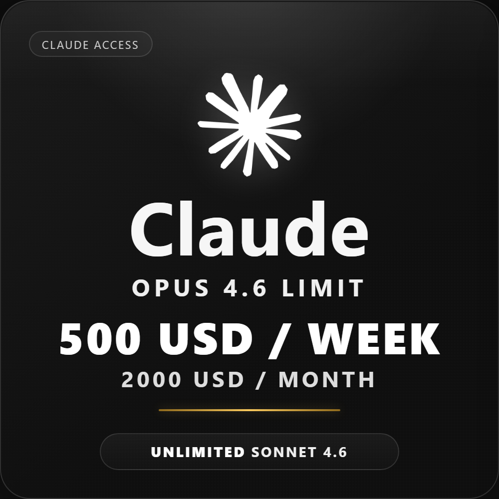 Claude, Claude API, Claude Code, Claude Opus 4.6, Claude Sonnet 4.6, Claude Haiku 4.5, Anthropic API, proxy api, API key, AI coding, code assistant, IDE AI, Claude access, Opus 4.6, 500 USD weekly, 2000 USD monthly, Sonnet 4.6 unlimited, Haiku 4.5 unlimited