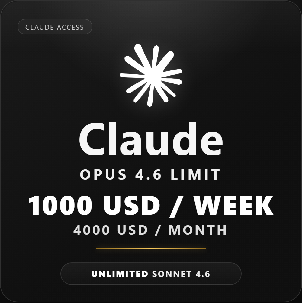 Claude, Claude API, Claude Code, Claude Opus 4.6, Claude Sonnet 4.6, Claude Haiku 4.5, Anthropic API, proxy api, API key, AI coding, code assistant, IDE AI, Claude access, Opus 4.6, 1000 USD weekly, 4000 USD monthly, Sonnet 4.6 unlimited, Haiku 4.5 unlimited