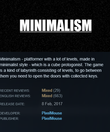 Минимализм — платформер с множеством уровней, выполненный в минималистичном стиле, с кубическим главным героем. Игра представляет собой своего рода лабиринт, состоящий из уровней, чтобы пройти между ними, нужно открывать двери собранными ключами.