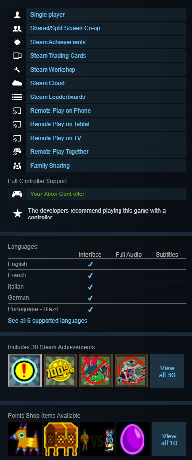 Таблицы лидеров Steam, достижения и коллекционные карточки, поддержка нескольких слотов сохранения, постоянная разблокировка костюмов между сохранениями.