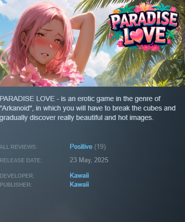 PARADISE LOVE — это эротическая игра в жанре «Арканоид», в которой вам предстоит разбивать кубики и постепенно открывать для себя по-настоящему красивые и пикантные картинки.