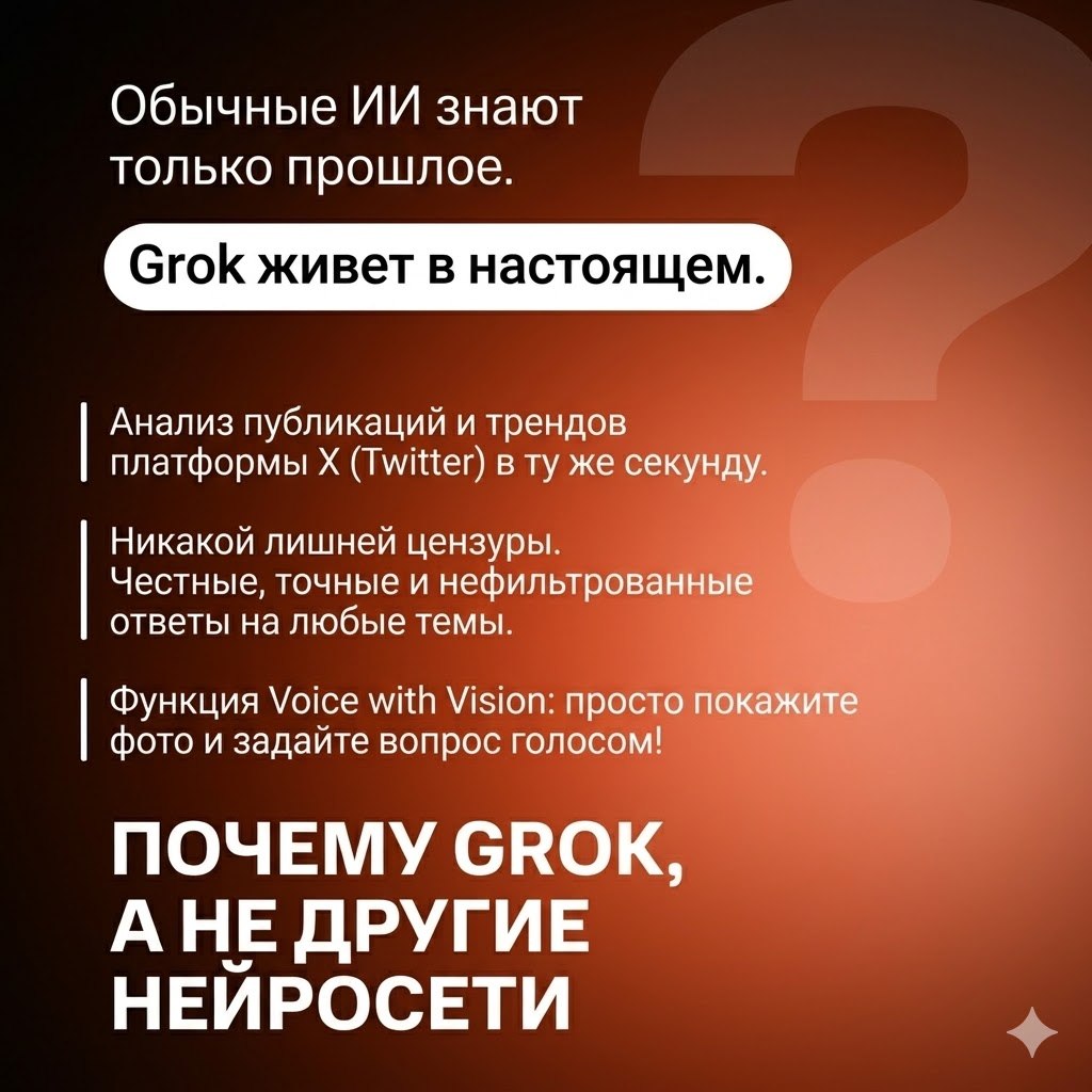 🌐 Real-Time X Integration: Доступ к актуальным мировым новостям и трендам в режиме реального времени. Грок знает то, что произошло 5 минут назад.