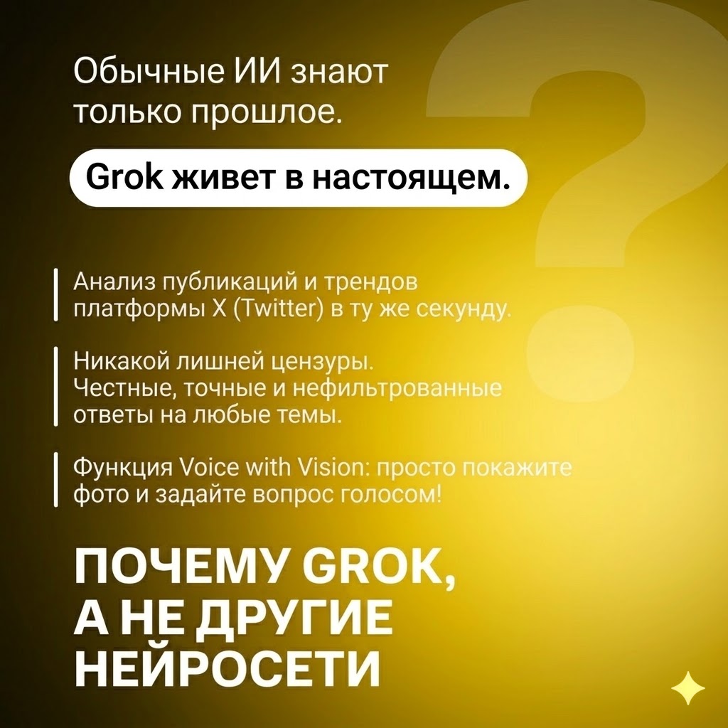 🌐 Real-Time X Integration: Доступ к актуальным мировым новостям и трендам в режиме реального времени. Грок знает то, что произошло 5 минут назад.