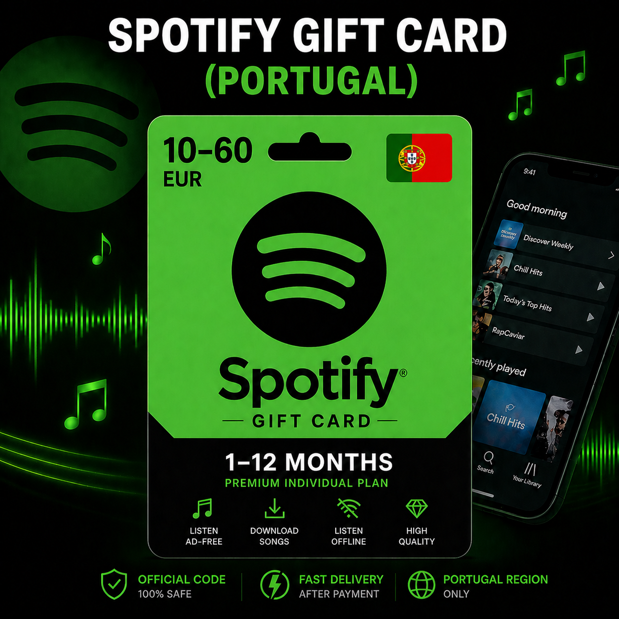 Подарочную карту Spotify Portugal на срок от 1 до 6 месяцев — выберите нужный вариант при покупке
