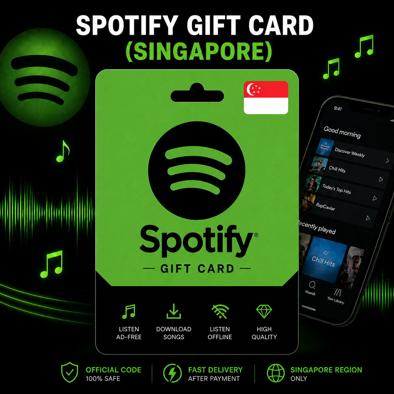 Подарочную карту Spotify Singapore номиналом 9.90 / 29.70 / 59.40 SGD — выберите нужный вариант при покупке