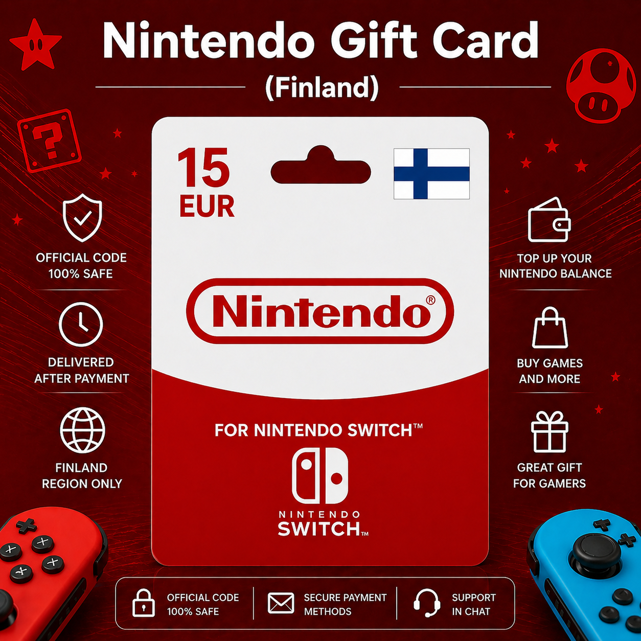 Подарочную карту Nintendo (Финляндия) номиналом от 15 до 100 EUR — выберите нужную сумму при покупке